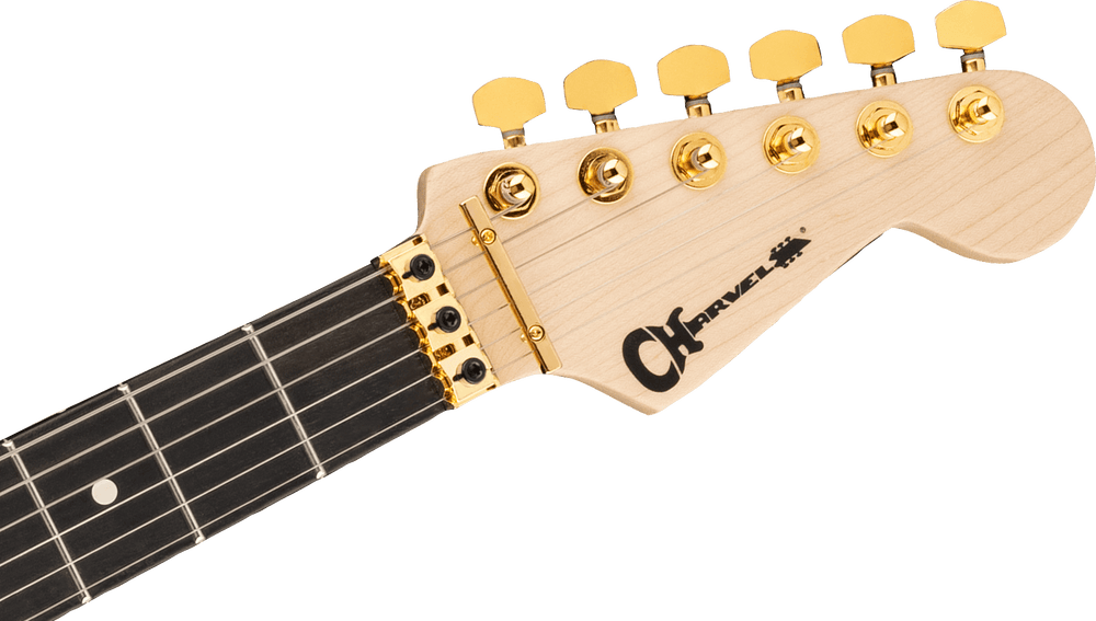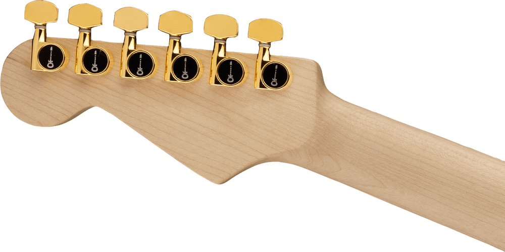 Charvel®-branded sealed die-cast tuners, Charvel neck plate and standard strap buttons
