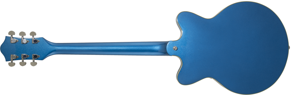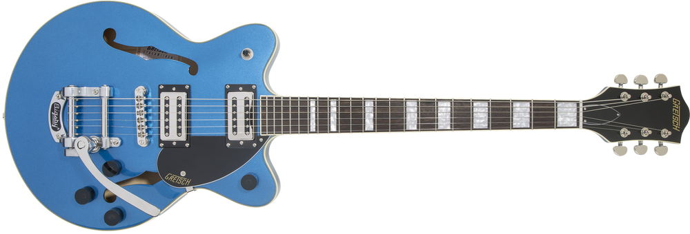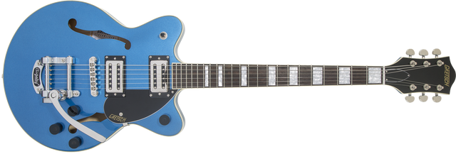 Gretsch G2655T CB JR DC FBL Streamliner, double cutaway, center block, laminated maple body, body lower bout 13,4", body depth 1,75"nato neck, , rosewood fretboard, fretboard radius 12", 22 medium frets, nut width 42,9mm, scale 629mm, 2x gretsch broadTron humbucker pickups, control for 2 volume, 1 tone and 1 master volume, 1 switch, adjust-o-matic secured bridge, bigsby b60 tremolo, finish Fairlane Blue.