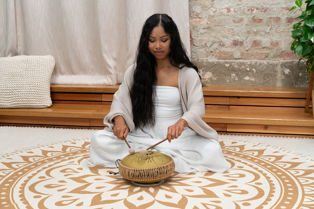 The Meinl Sonic Energy 10" Medium Octave Steel Tongue Drum is made of high-quality stainless steel. Its eight-octave notes deliver the tones in two octaves. This creates a wonderful, meditative sound similar to the tone of a handpan. A sound hole located at the bottom of the drum can be sealed with a silicon plug to provide an even more compact sound. Three silicone feet at the bottom keep the drum from slipping. The Medium Octave Steel Tongue Drum can be played with your fingers or mallets. To begin playing, simply place it on a flat surface or your lap. The drum comes with two wooden mallets with soft-wrapped rubber heads, and a nice carrying bag with zipper and handle.
