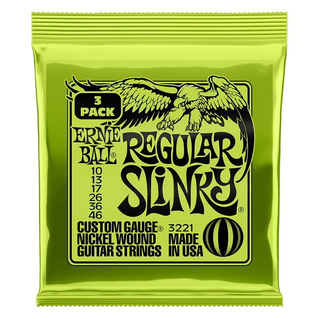 Now available in convenient three-set packs Ernie Ball Regular Slinky Electric Strings are our top selling set, and are favored by many musicians around the globe. Regular Slinky strings are played by Eric Clapton, John Mayer, Steve Vai and legions of guitar players worldwide These strings are precision manufactured to the highest standards and most exacting specifications to ensure consistency, optimum performance, and long life. Regular Slinky wound strings are made from nickel plated steel wire wrapped around a hex shaped steel core wire. The plain strings are made of specially tempered tin plated high carbon steel producing a well balanced tone for your guitar. Gauges .010, .013, .017, .026, .036, .046