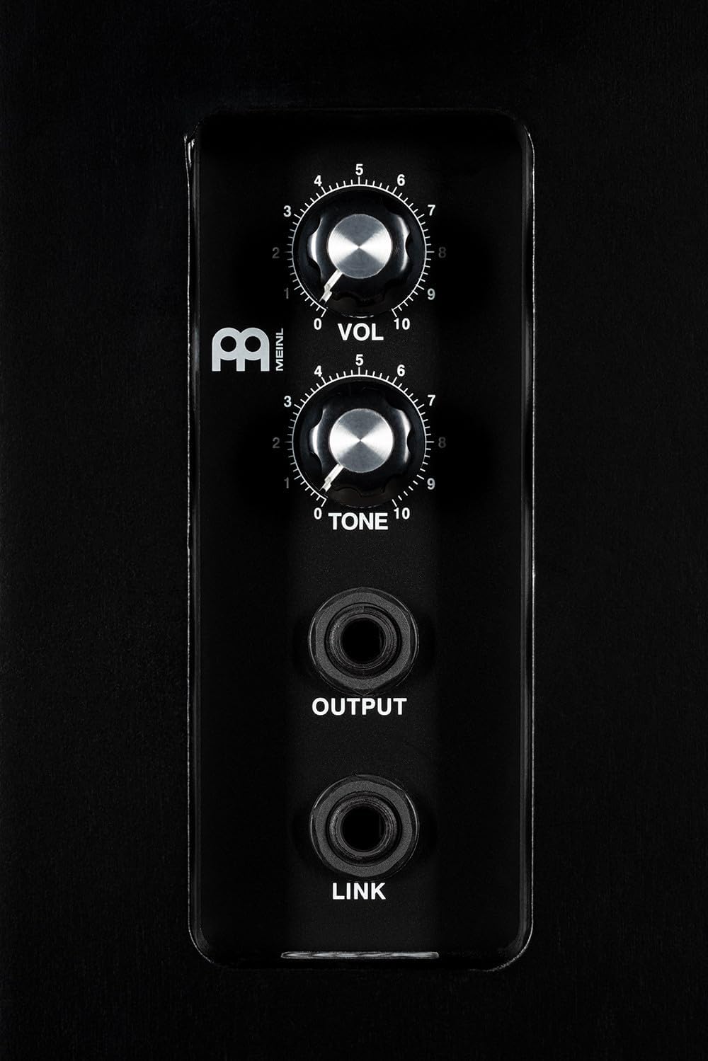 ZOOM IN: there are two dials and two quarter-inch jacks; VOLUME: set your levels, TONE: adjust for more bass or snare, OUTPUT: send your signal to an amp or PA, LINK: join other Meinl Percussion passive pickup instruments through the cajon's system